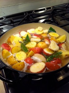 Place the potatoes in a Dutch oven or frying pan. Pour enough stock to come up half-way on the potatoes. Add vermouth and drizzle with olive oil. Nestle in the garlic and herbs.